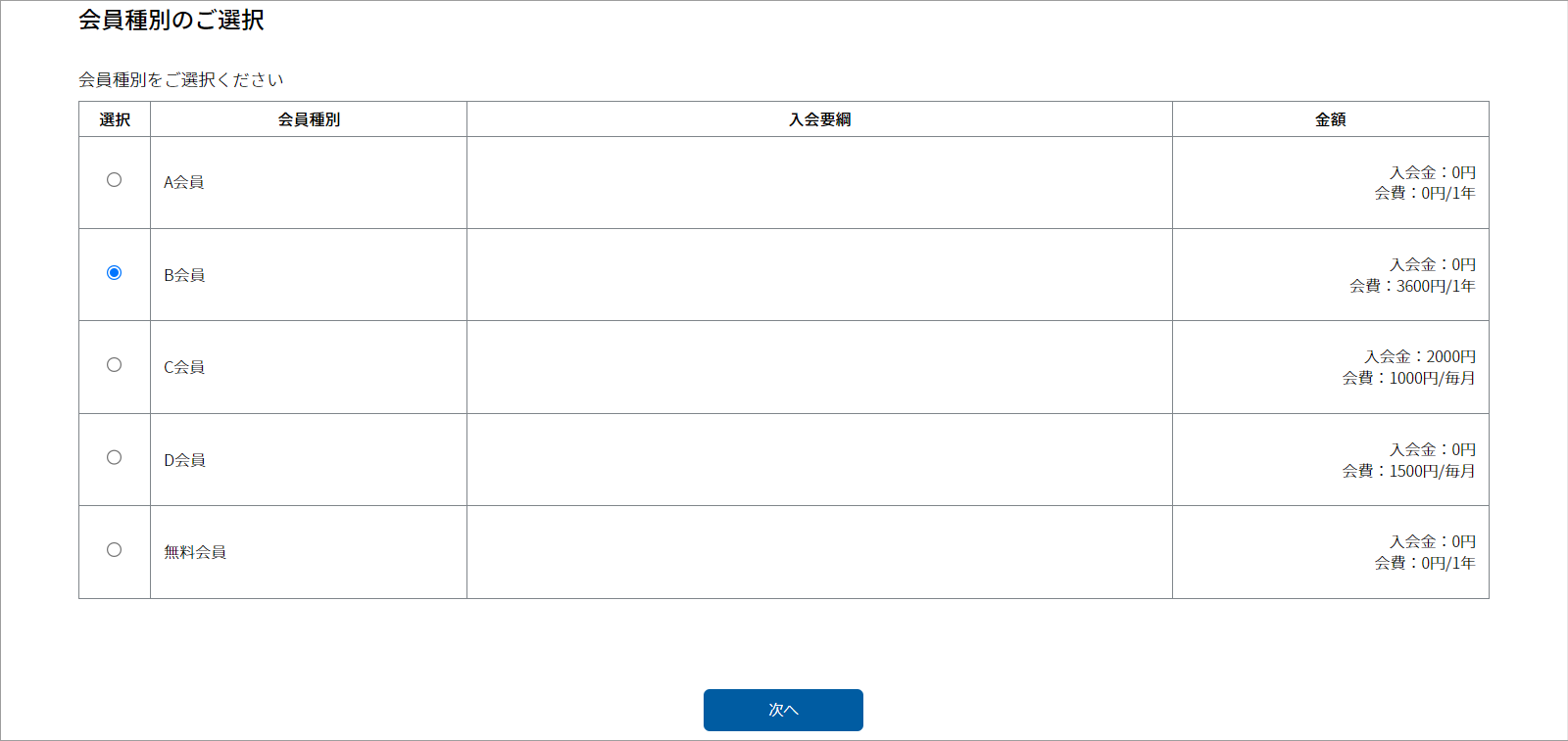 ②『会員種別のご選択』画面に遷移しますので、ご希望の会員種別を選択し、「次へ」をクリックします。