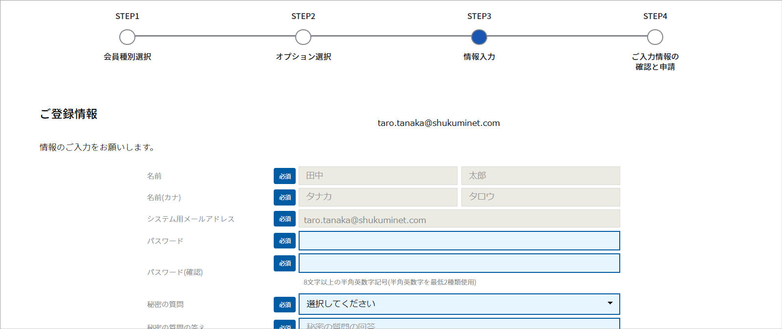 - 会員種別、オプション選択後、『ご登録情報』の入力画面に遷移します。