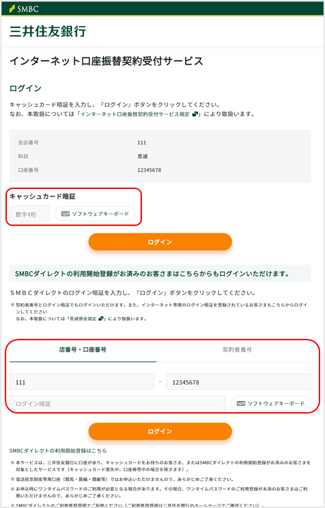 ①「キャッシュカードの暗証番号」を入力し、「ログイン」をクリックします。SMBCダイレクトをご利用の方は、ログイン暗証を入力してください。