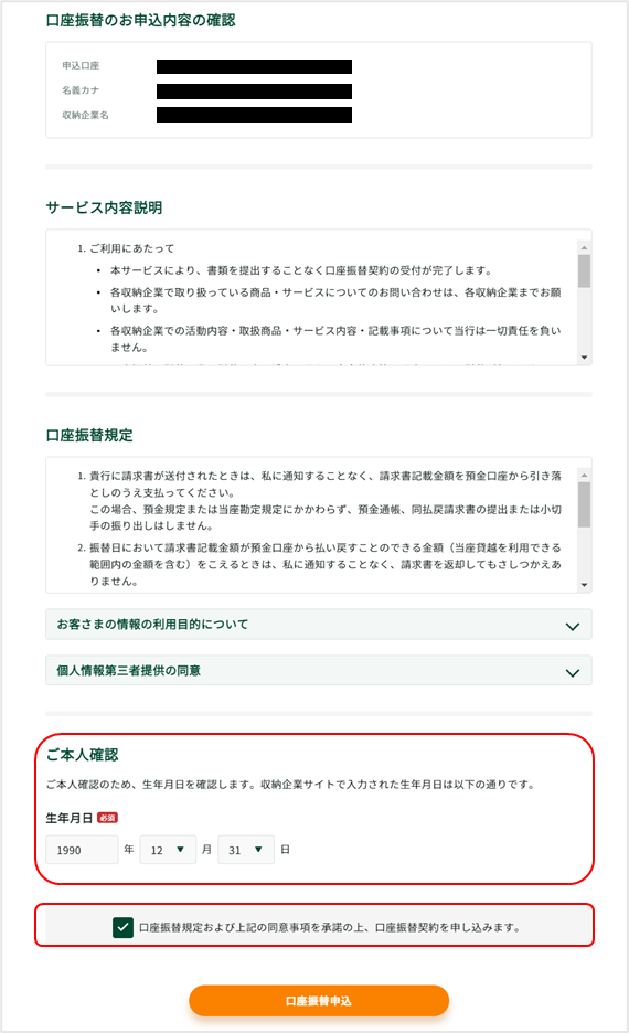 ②「生年月日」を入力し、規約同意箇所にチェックします。